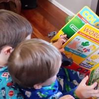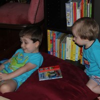 I don’t think they could make themselves any more comfortable. After pulling the cushions off the couch and dragging them over to a convenient location right near the bookcase. They sit down to read books with each other.